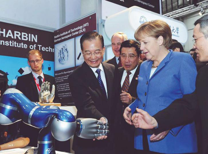 时任国家总理温家宝和德国总理默克尔与机器人灵巧手“握手”