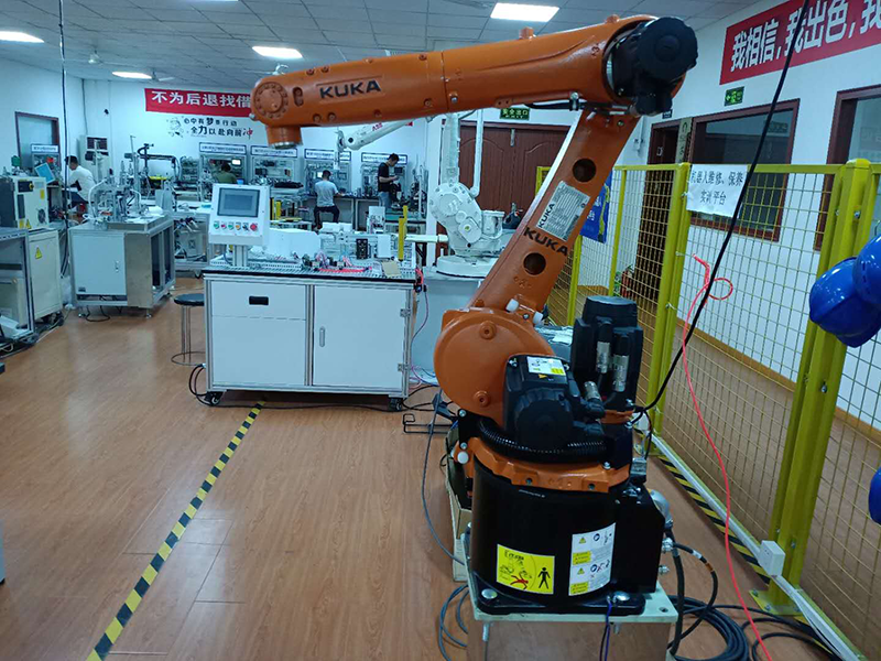 六轴机器人的第一个关节能像四轴机器人一T谒平面自由旋转,后两个关节能在垂直平面移动。此外,六轴机器人有一个“手臂”,两个“腕”关节,这让它具有人类的手臂和手腕类似的能力。