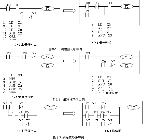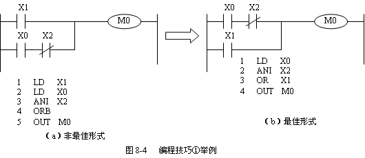 (1)把串联触点多的电路编在上方,如图8-4所示,可见(b)形式减少使用ORB指令或多重输出指令等。