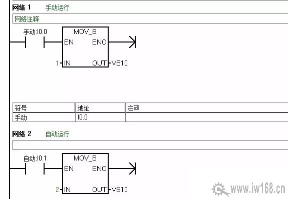1、PLC和上位机(或触摸屏)组成监控系统时,在画面上很多时候需要有“手动”、“自动”等控制模式(一般都是多个只能一个时)。在程序里面可以用“MOV”指令。如:当选择“手动”就将常数1 MOV到一个寄存器VB10里面,当选择“自动”就将2 MOV到同一寄存器VB10。只要判断寄存器的数据是多少,就知道系统是那种控制方式。这样的思路好处是容易理解,不需要互锁之类的麻烦程序。