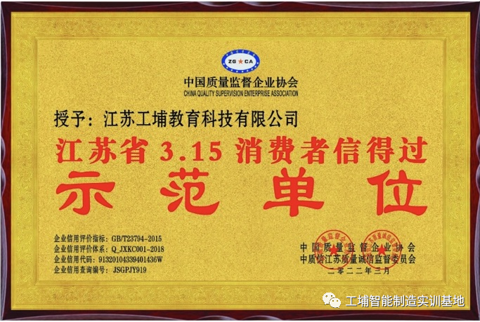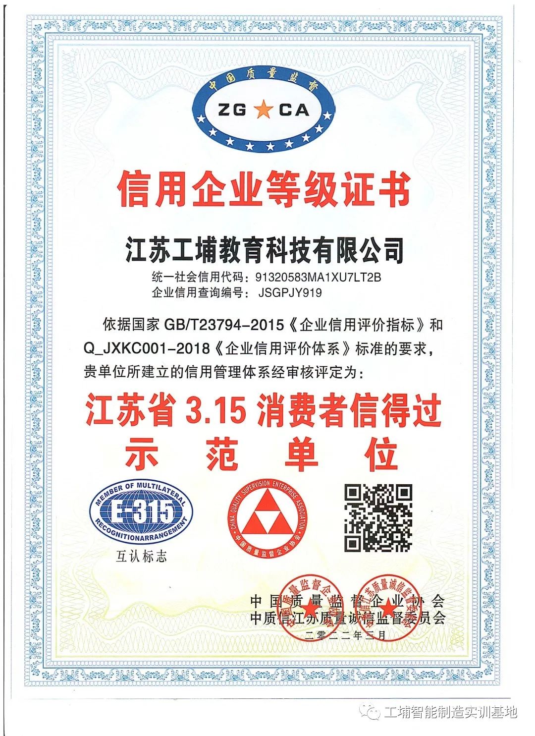 传递质量信任,引导质量消费,未强化人民群众对消费品安全的知情权和监督权。依据国家GB/T23794-2015《企业信用评价指标》和Q_JXKC001-2018《企业信用评价体系》标准的要求贵单位所建立的信用管理体系经审核评定为,江苏工埔教育荣获“全国质量监督企业协会授予:江苏省3.15消费者信得过示范单位。江苏职业教育行业质量领先品牌,全国职业教育行业质量领先企业”三项殊荣,这是对企业及产品的莫大肯定和极大信赖。