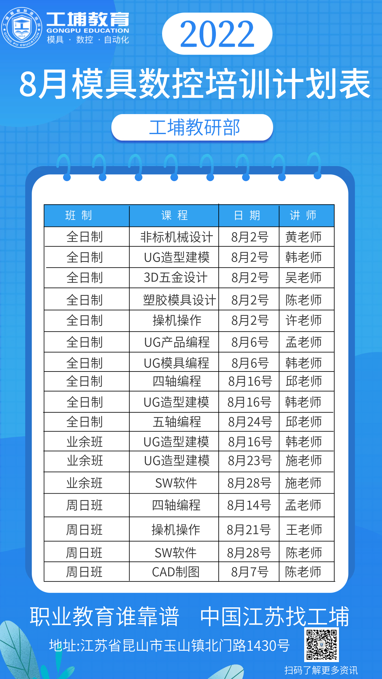 2022年8月份【模具数控】课程开班啦! 一、开班信息--预计学员200人 1、开班班制:全日制/业余制/周末班 二、报名须知 1、报名流程:网站报名 课程定制 预约上门 前台登记 课程老师接待 开班入学 ; 2、报名需带好个人有效证件,疫情期间,做好个人防护; 3、提供食宿,费用自理 (住宿300-500/月, 12/餐 ); 4、报名电话:400-008-3606 滚动式开班,随到随学,全日制/业余制/周末班,总有一种适合你; 陪伴式教学,学会为止, 课程老师+授课老师+辅导老师360全方位服务; 一人多机实操,毕业即就业 , 多家合作企业保障大家的就业; 周边交通便力,公交1路直达、衣食住行均可提供,立即咨询报名!