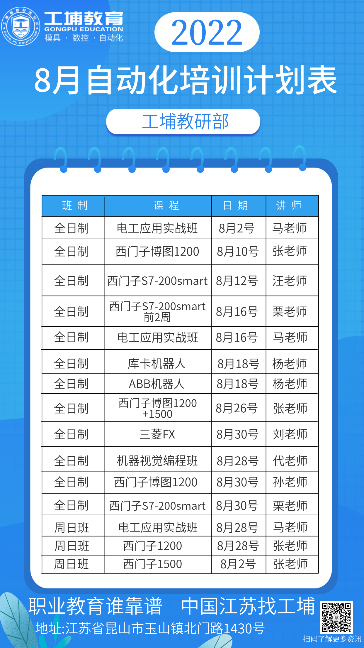 2022年8月份【自动化专业】课程开班啦! 一、开班信息--预计学员200人 1、开班班制:全日制/业余制/周末班 二、报名须知 1、报名流程:网站报名 课程定制 预约上门 前台登记 课程老师接待 开班入学 ; 2、报名需带好个人有效证件,疫情期间,做好个人防护; 3、提供食宿,费用自理 (住宿300-500/月, 12/餐 ); 4、报名电话:400-008-3606 滚动式开班,随到随学,全日制/业余制/周末班,总有一种适合你; 陪伴式教学,学会为止, 课程老师+授课老师+辅导老师360全方位服务; 一人多机实操,毕业即就业 , 多家合作企业保障大家的就业; 周边交通便力,公交1路直达、衣食住行均可提供,立即咨询报名!