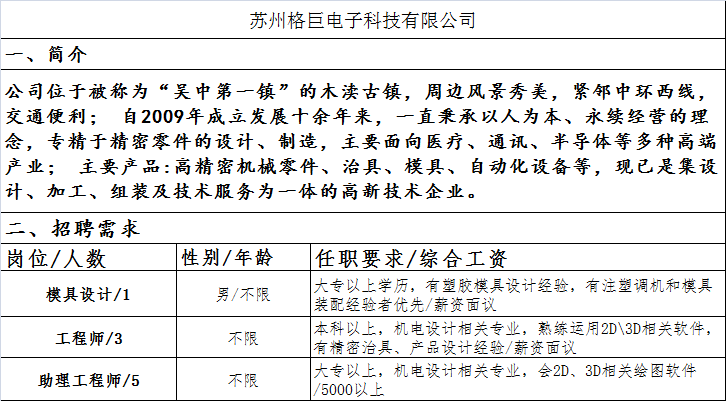 苏州格巨电子招聘信息